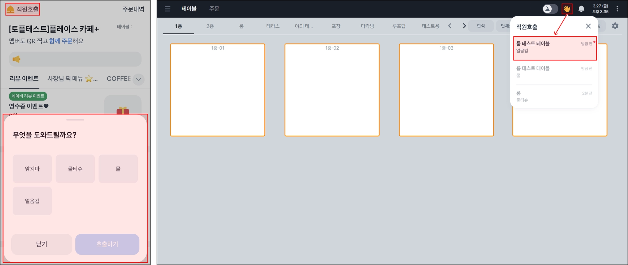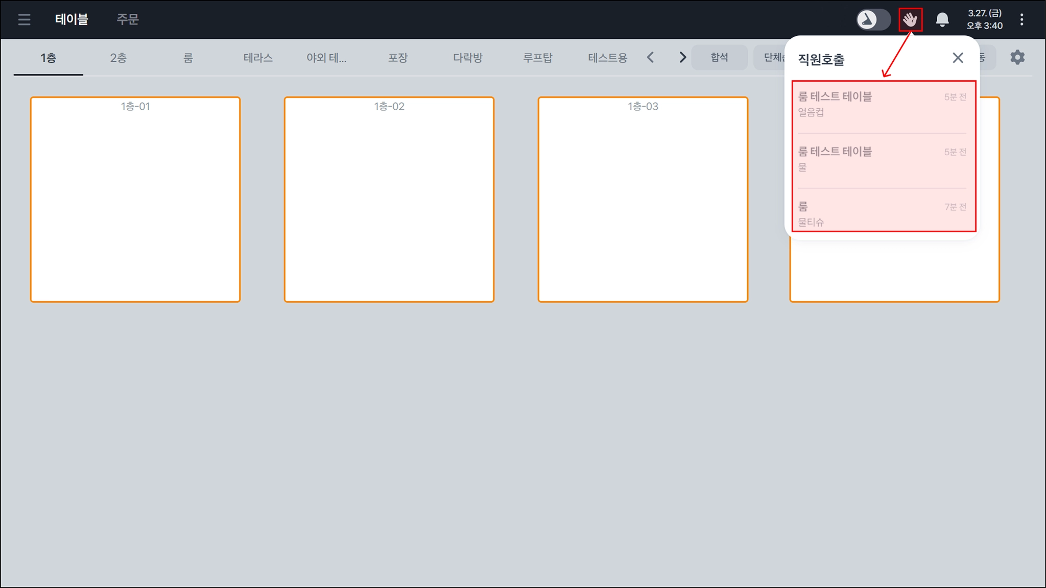 호출하기를 누르면, 직원호출 시 알림이 포스 상단에 표시되고, 확인 후 X를 누르면 노란색 표시는 사라져요.