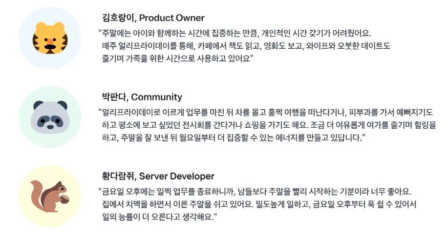한 주 동안 힘차게 달린 후, 금요일에 휴식을 일찍 시작하는 팀원들을 위해 금요일 오후 2시 이후에는 미팅이나 인터뷰를 진행하지 않고 있어요.