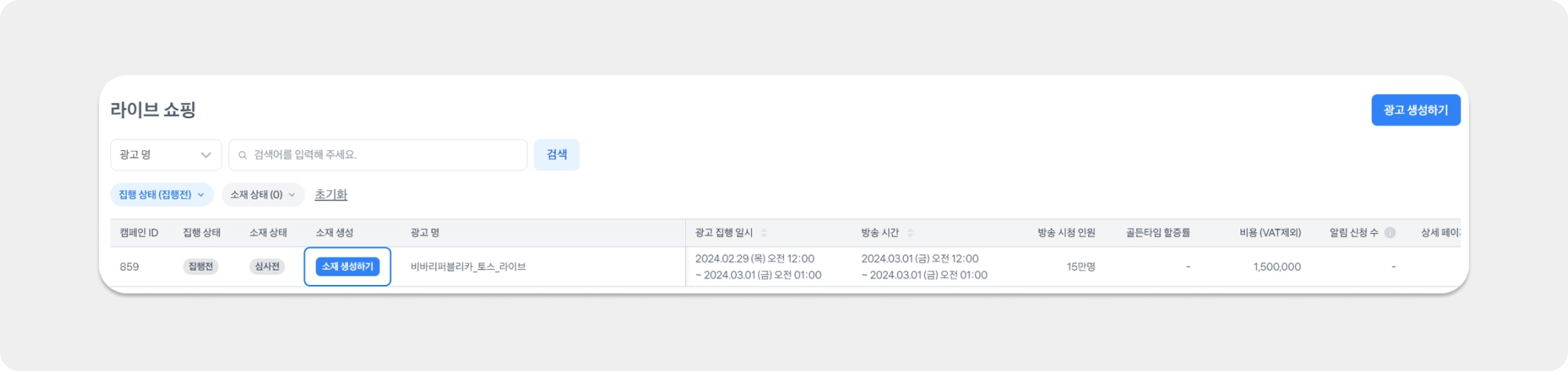광고 생성하기 : 라이브 쇼핑 메뉴 접속 > 오른 쪽 위 ‘광고 생성하기’ 버튼 클릭
