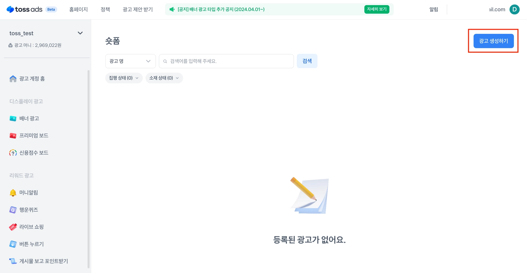 우측의 광고 생성하기 버튼을 클릭해주세요
