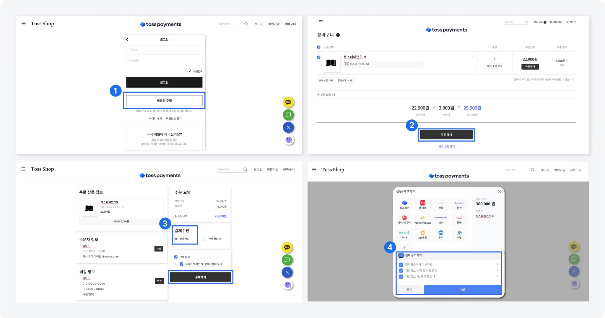 예시화면 ) 비회원구매하기의 경우 (회원제의 경우 TEST ID/PW를 전달해주셔야합니다)