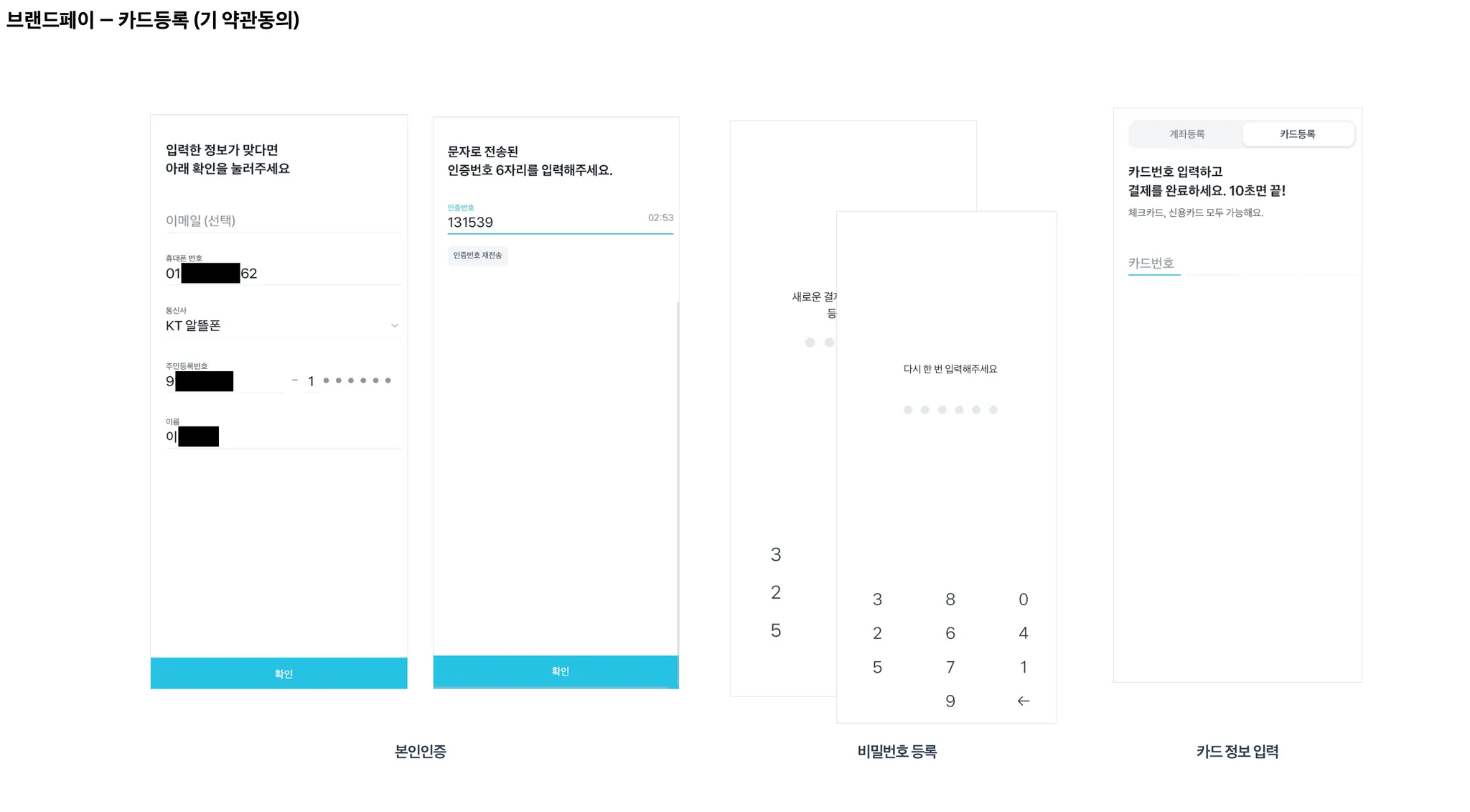 브랜드페이 결제 수단을 처음 등록하면, 브랜드페이 회원 가입도 함께 이루어집니다. 이 과정에는 다음 단계들이 포함됩니다: