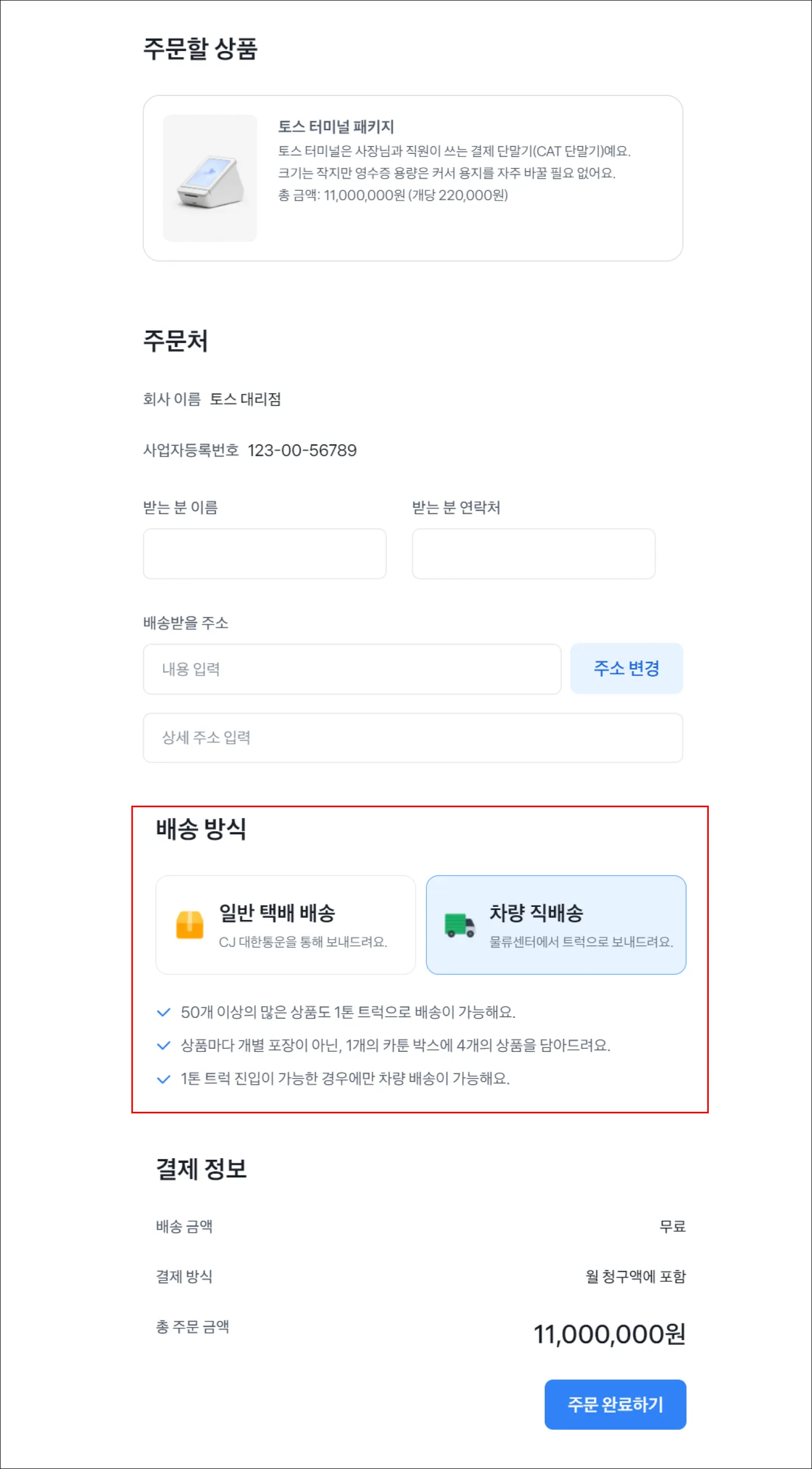수량 50개 이상부터는 일반 택배 배송과 차량 직배송 중 한 가지를 선택할 수 있어요.