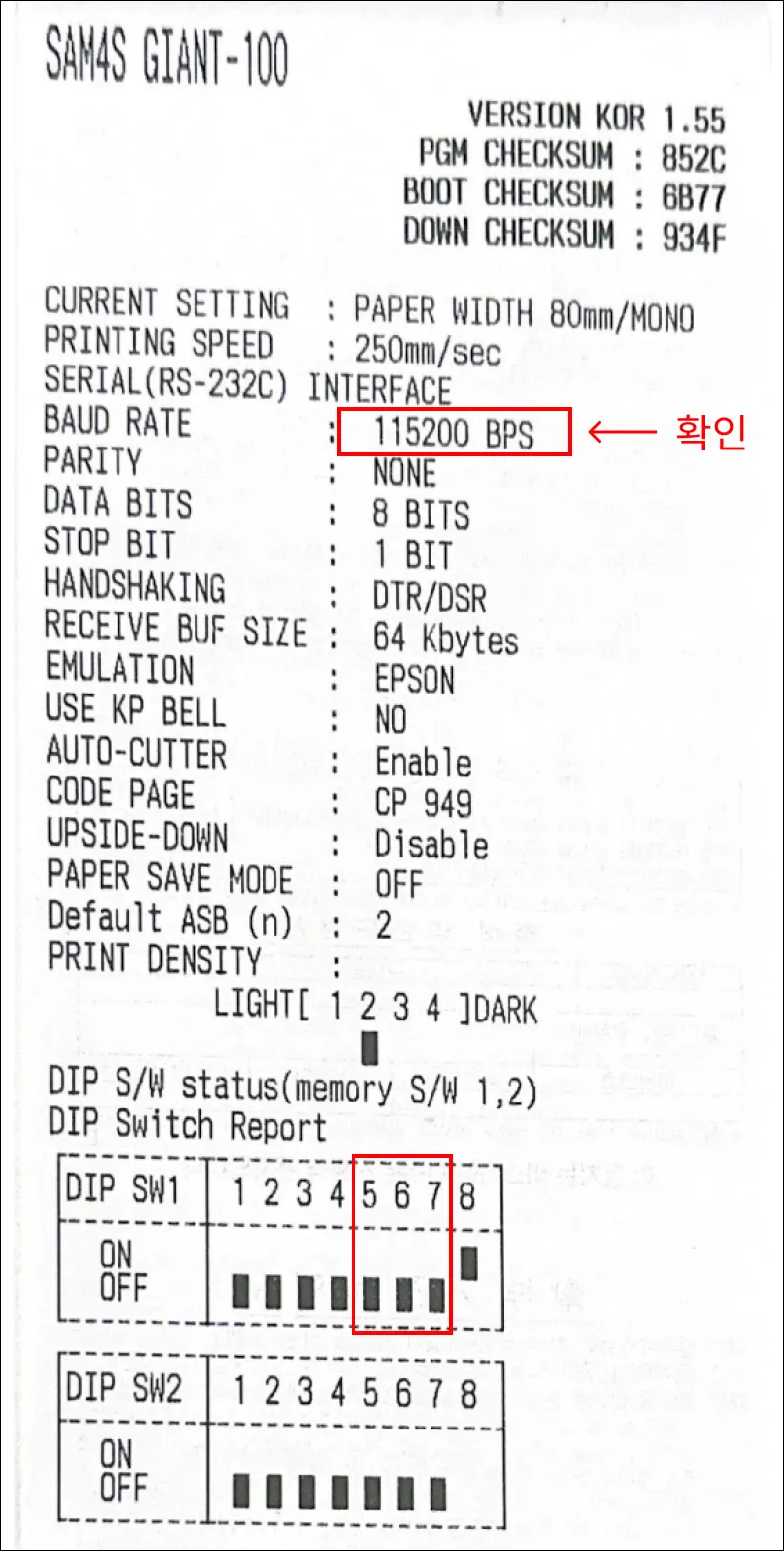 115200 BPS로 속도를 변경하기 위해서는 DIP SW1 5,6,7 부분의 스위치를 내려 OFF 해주세요.