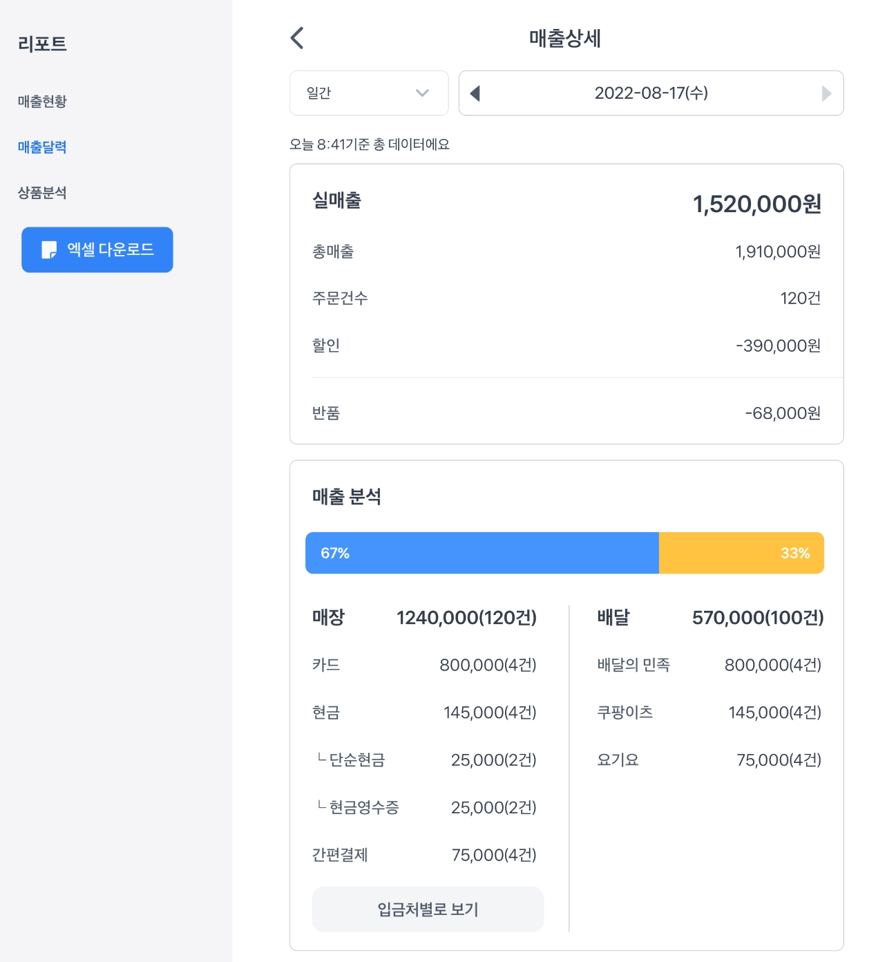 아래 방법대로 토스포스에서 배달 설정을 해주시면 배달프로그램에서 주문 접수하면 자동으로 주문내역이 저장되고 매출리포트에 반영됩니다.