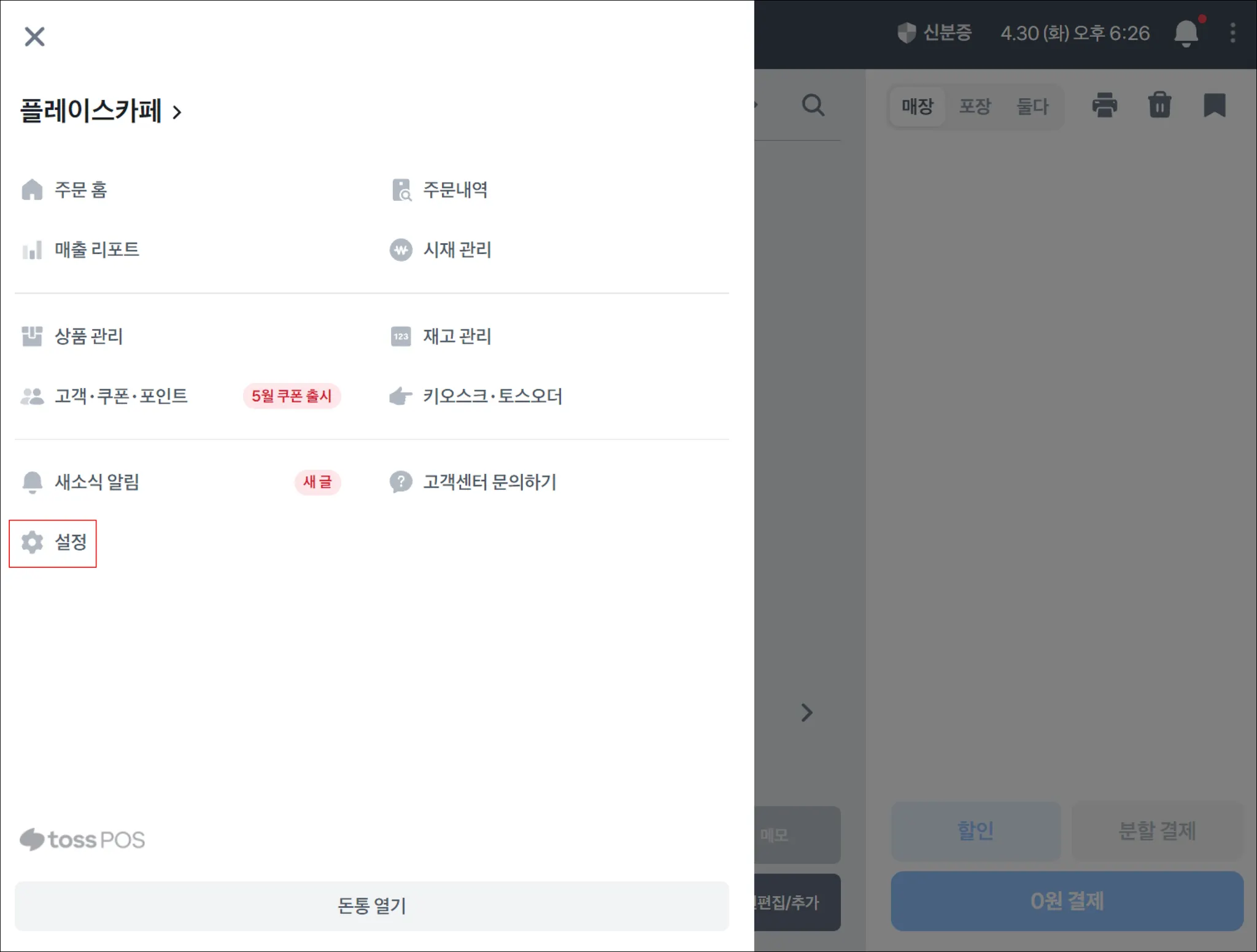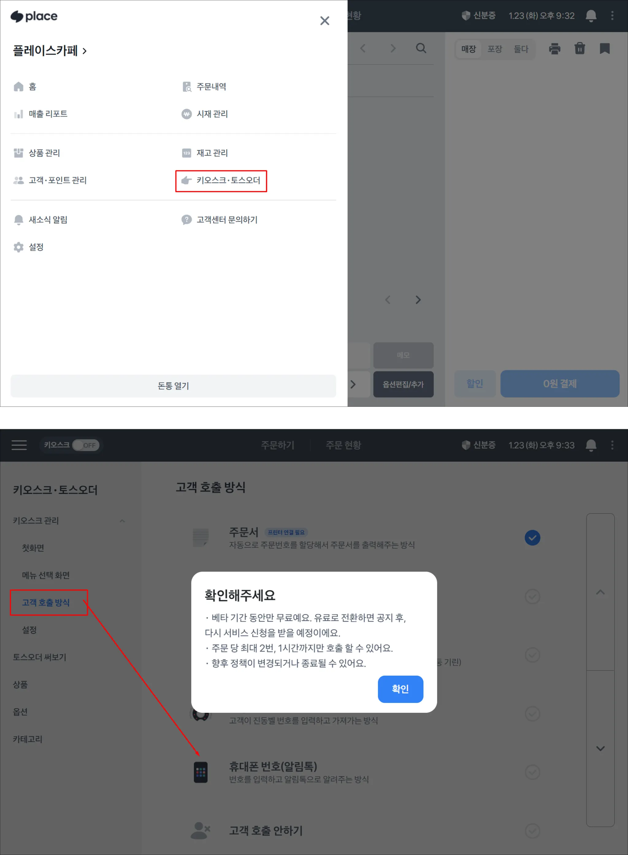 포스 왼쪽 상단 ≡ → 키오스크·토스오더 → 고객 호출 방식에서 휴대폰 번호(알림톡)을 선택할 수 있어요.