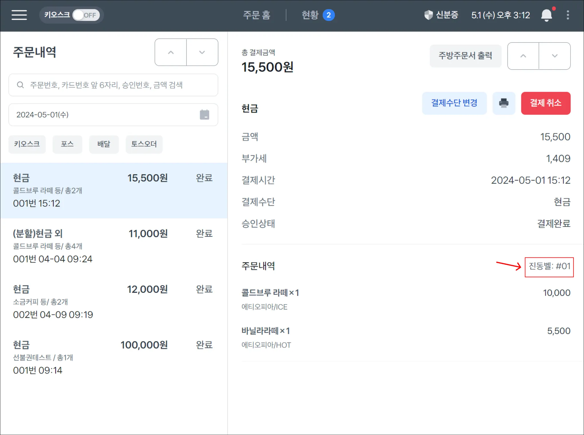 6. 주문서 상단에서 진동벨 번호를 확인할 수 있어요.