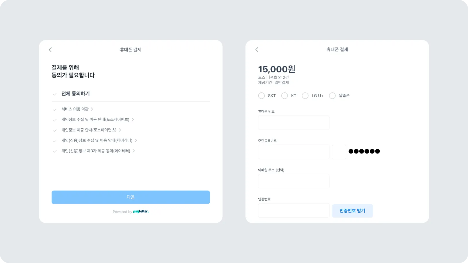 사용자가 구매 사이트에서 휴대폰 결제요청을 하면 PG사(토스페이먼츠)는 휴대폰결제 중계기관의 결제인증창을 띄워주고 휴대폰 본인인증을 진행합니다.