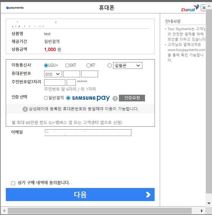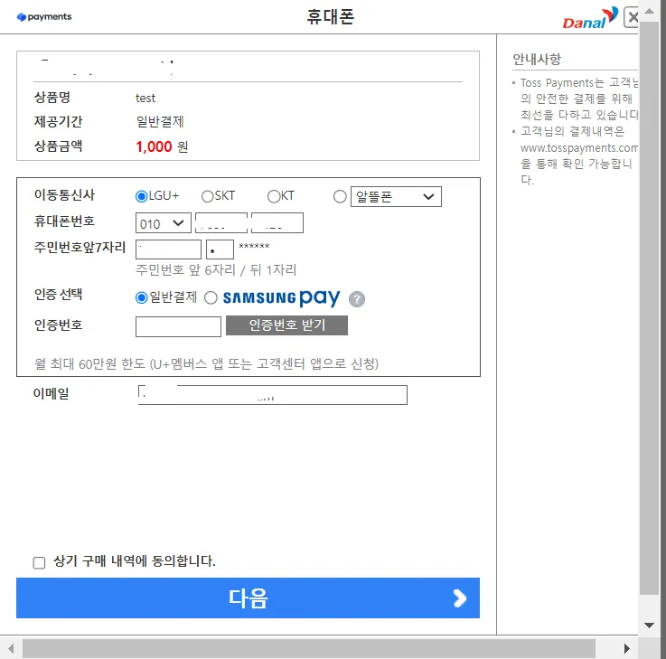 [다날 결제인증창