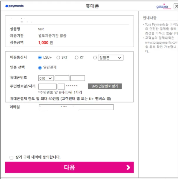 토스페이먼츠의 휴대폰결제 중계기관은 다날, 페이레터, 갤럭시아머니트리 등이 있습니다.)