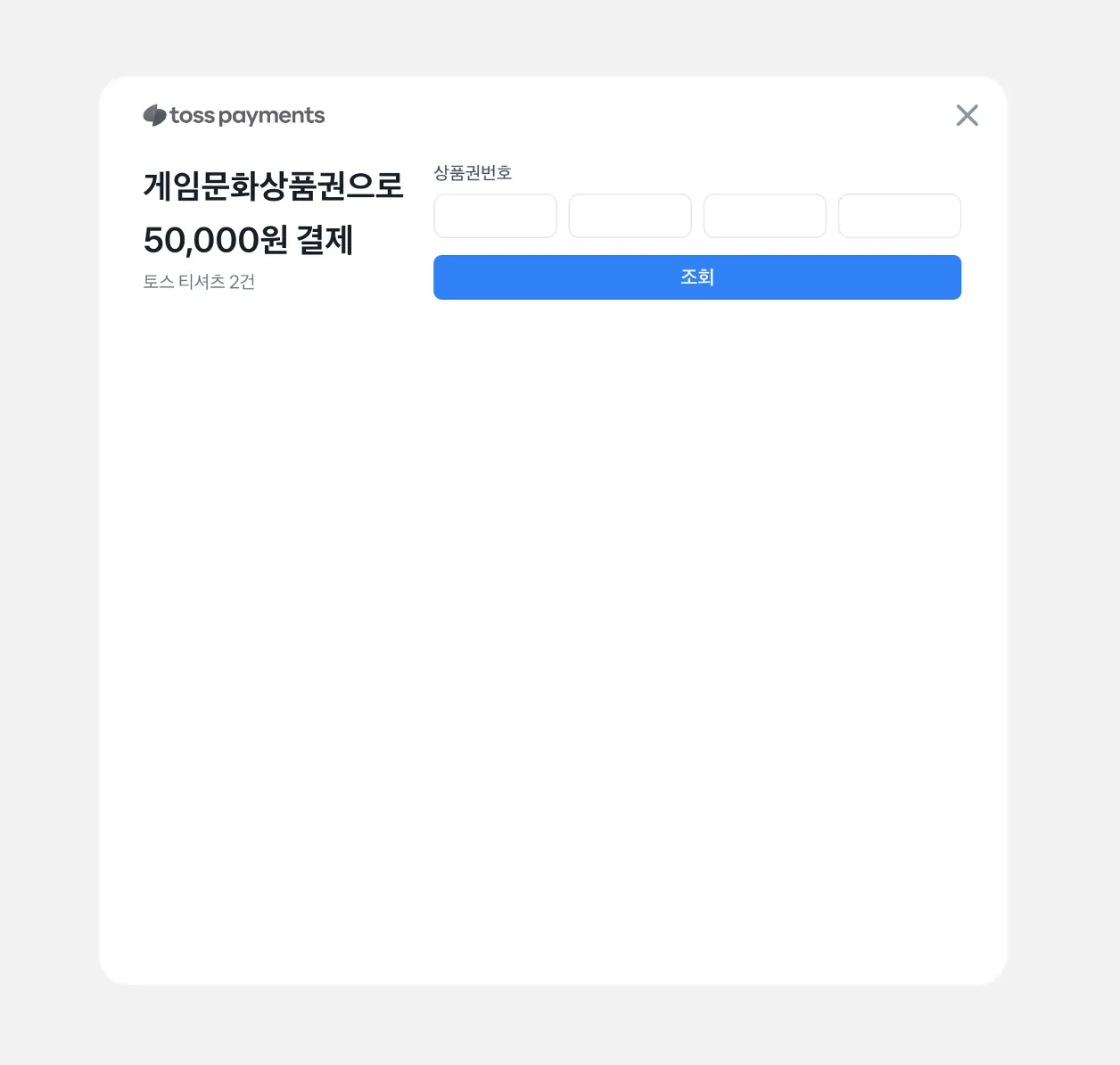 상품권 결제도 다른 통합결제창을 이용한 결제 방식과 동일하게 별도의 API는 제공하지 않고 결제창을 호출한후에 인증이 완료되면 paymentKey가 successURL 로 전달되고 전달받은 paymentKey 로 최종 승인 요청을 하시면 결제가 완료됩니다.