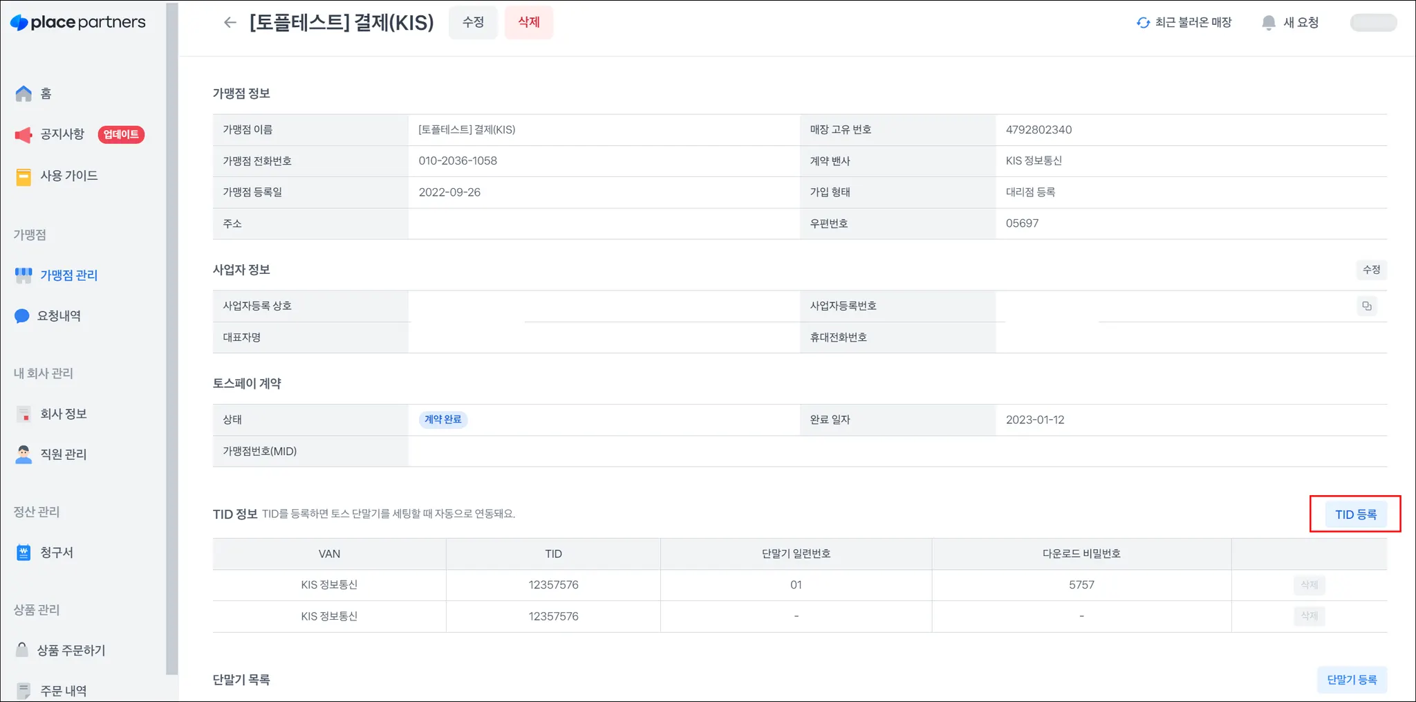 플레이스 파트너스 매장 정보 접속 → TID 등록 → 위 단말기 일련번호/다운로드 비밀번호 값 입력