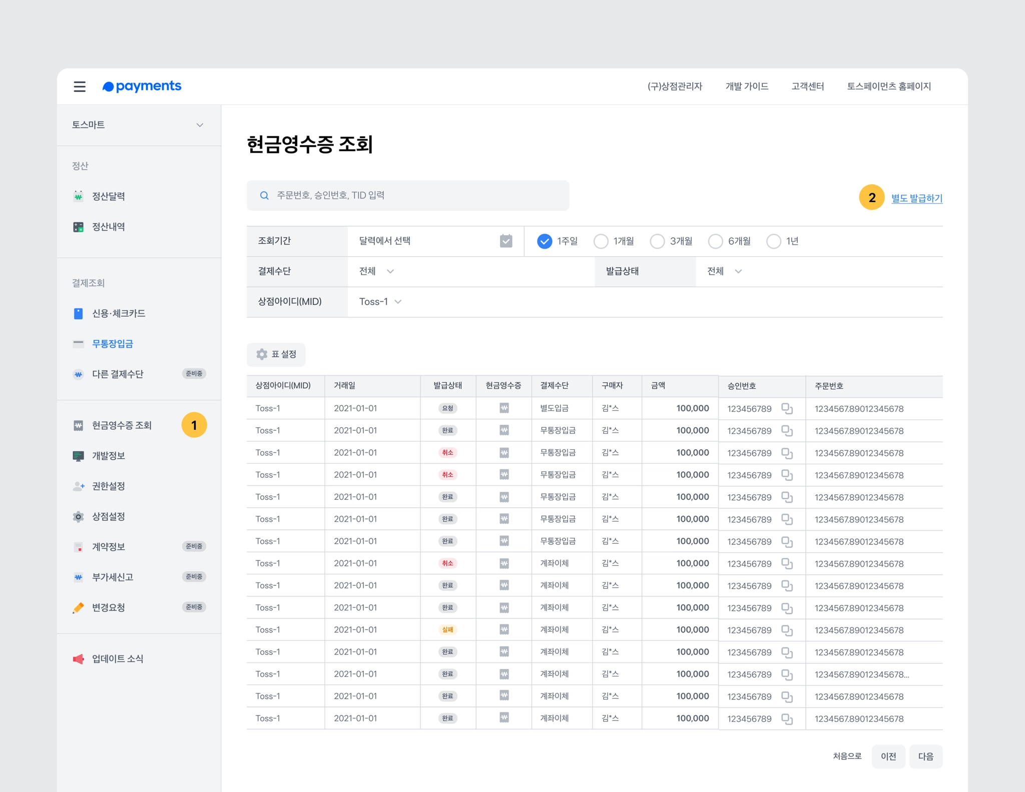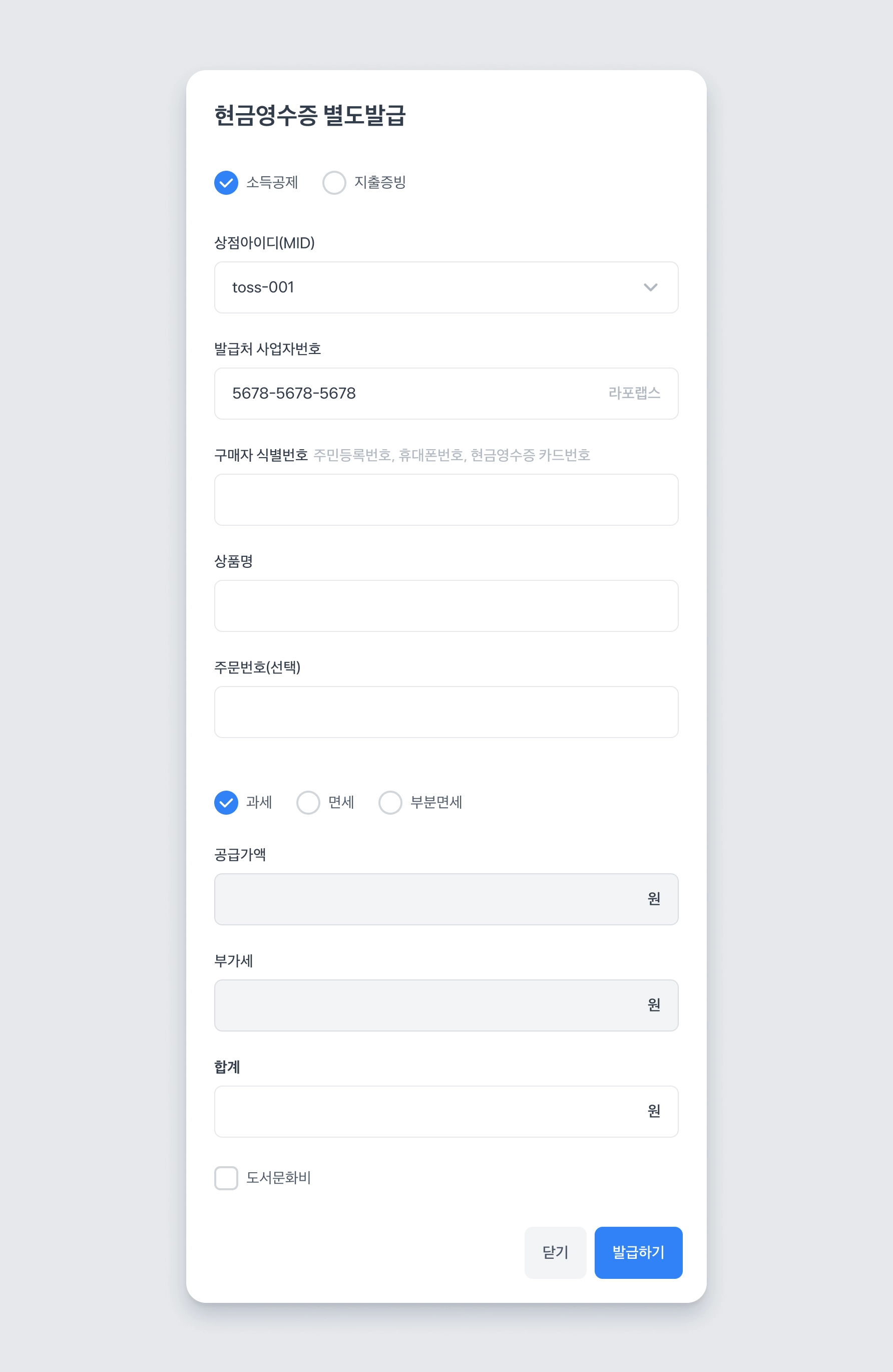 토스페이먼츠 상점관리자에서 PG결제가 아닌 현금 거래에 대해서도 현금영수증을 별도로 발급할 수 있어요.