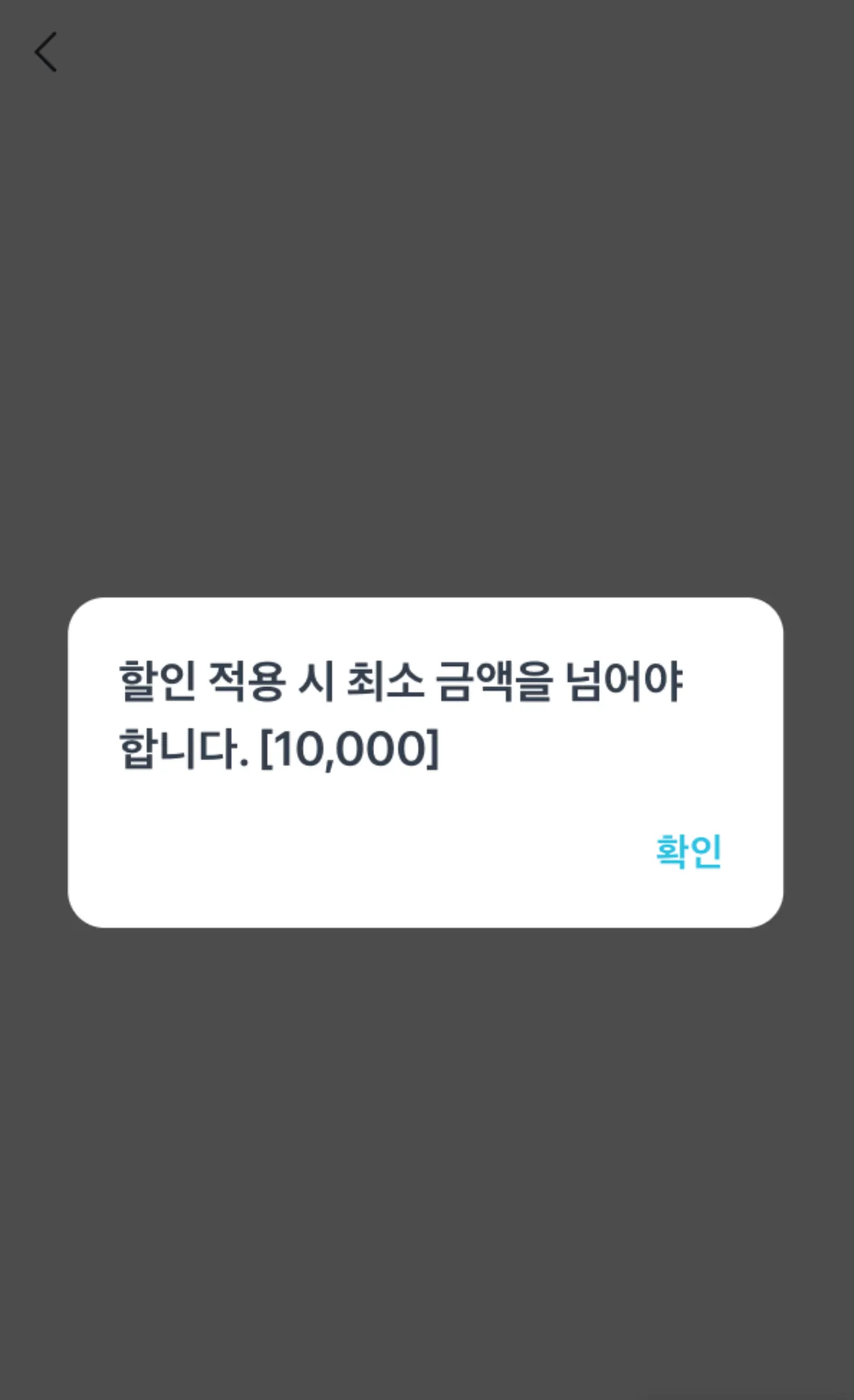 단, 응답값이 내려오더라도 프로모션 기준금액 (minimumPaymentAmount)과 결제금액을 비교해줘야해요. 기준금액에 맞지 않은 주문에 discountCode를 포함해 결제요청할 경우, 아래와 같이 에러가 발생하고 결제 실패되요.