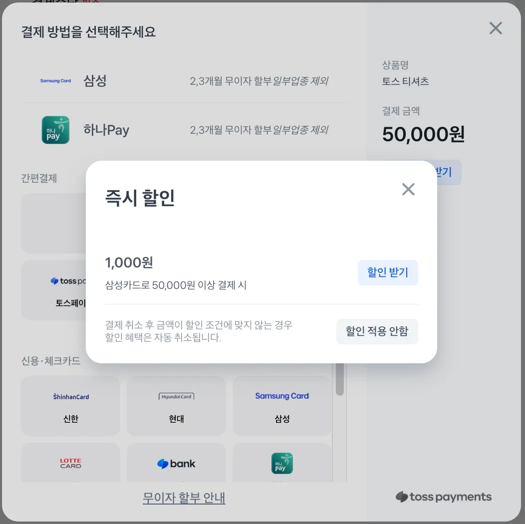 토스페이먼츠에서는 카드 및 계좌 즉시할인을 제공하고 있습니다. 아래는 프로모션 진행시, 연동 측면에서 각 제품별 고려해야할 부분입니다.