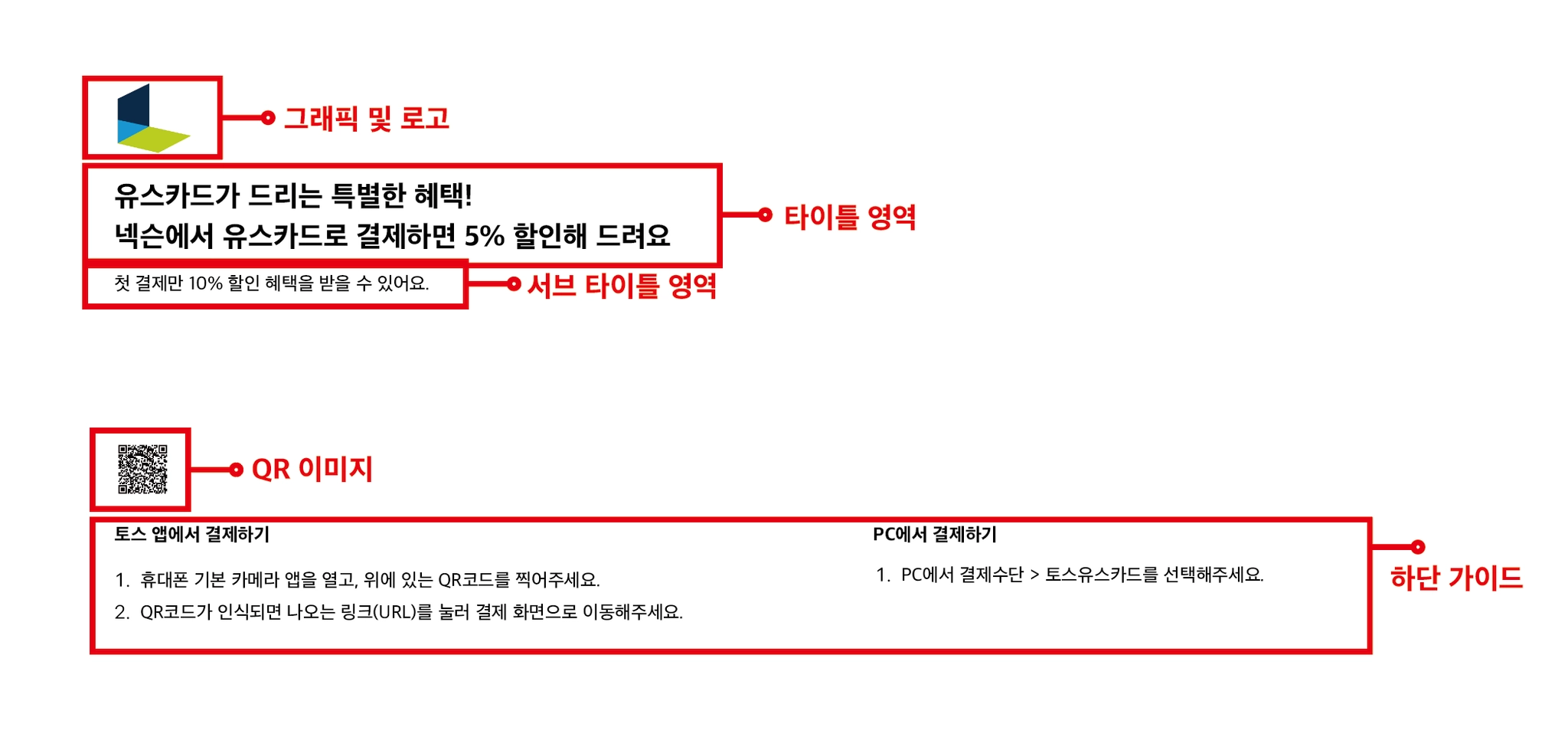 디자인 레이아웃은 그래픽 및 로고 / 타이틀 영역 / 서브 타이틀 영역 / 하단 가이드 / QR이미지 (선택)으로 구성됩니다.