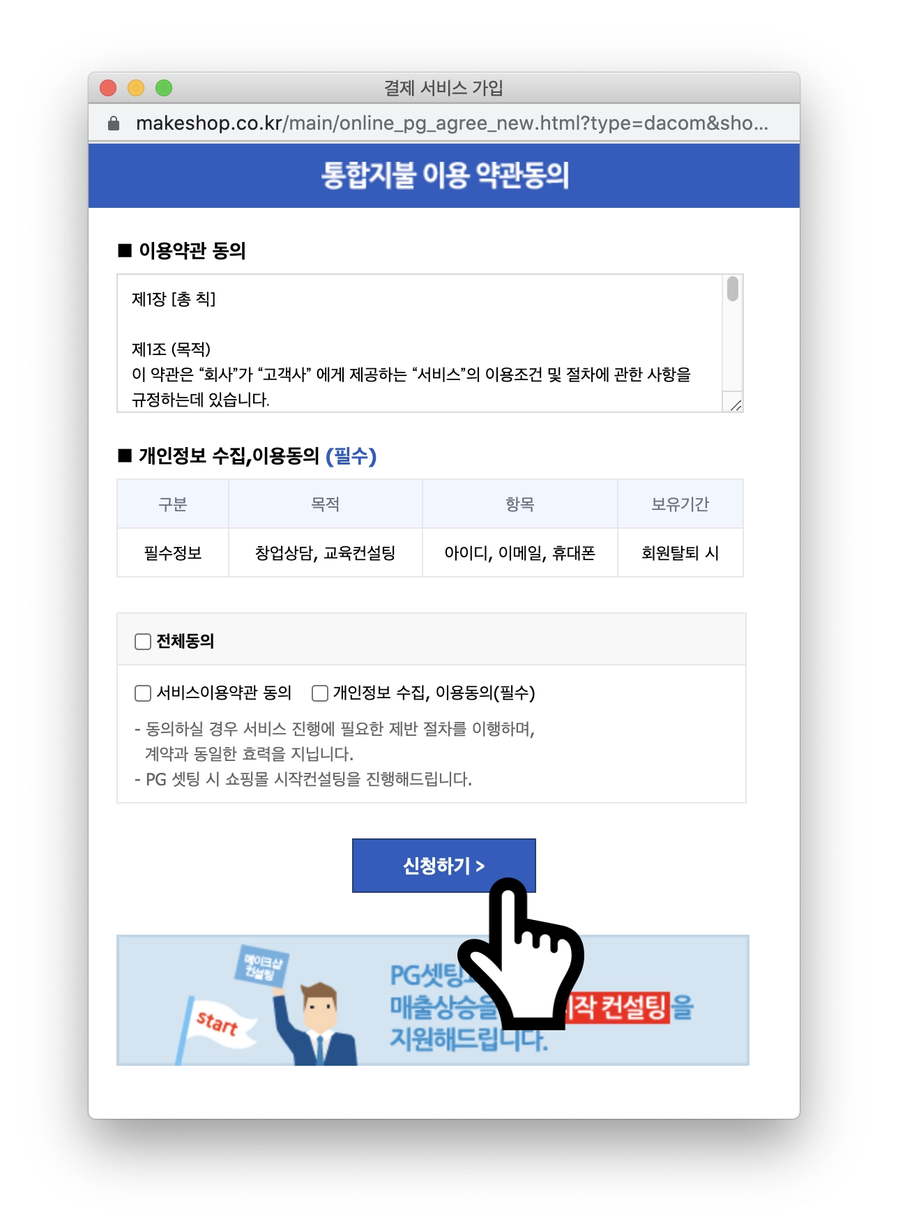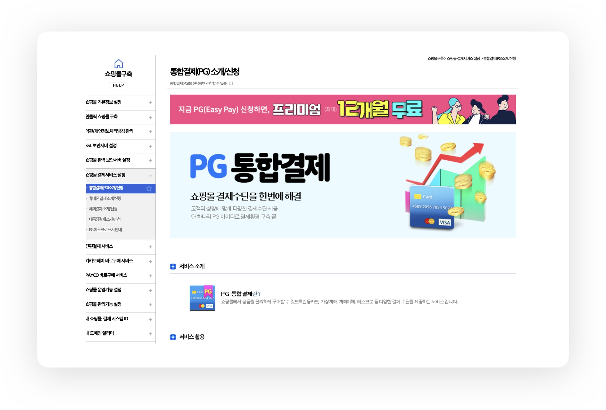 2. 쇼핑몰 구축 > 쇼핑몰 결제서비스 설정 > 통합결제 신청 메뉴로 이동하세요.