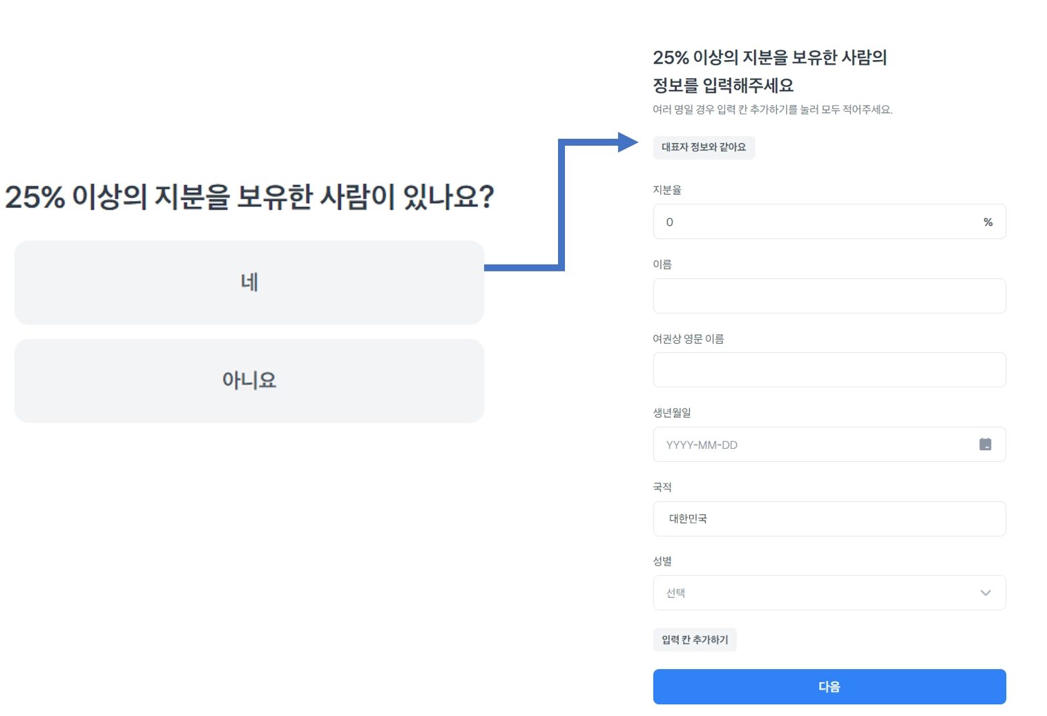 개인을 선택 하셨다면, 지분을 보유한 사람의 정보를 입력해 주세요