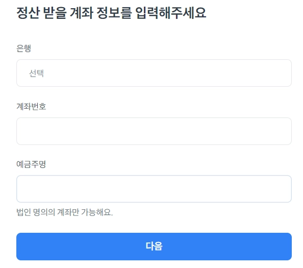 법인 사업자의 정산 계좌는 법인 명의와 예금주명이 같아야 등록이 가능해요.