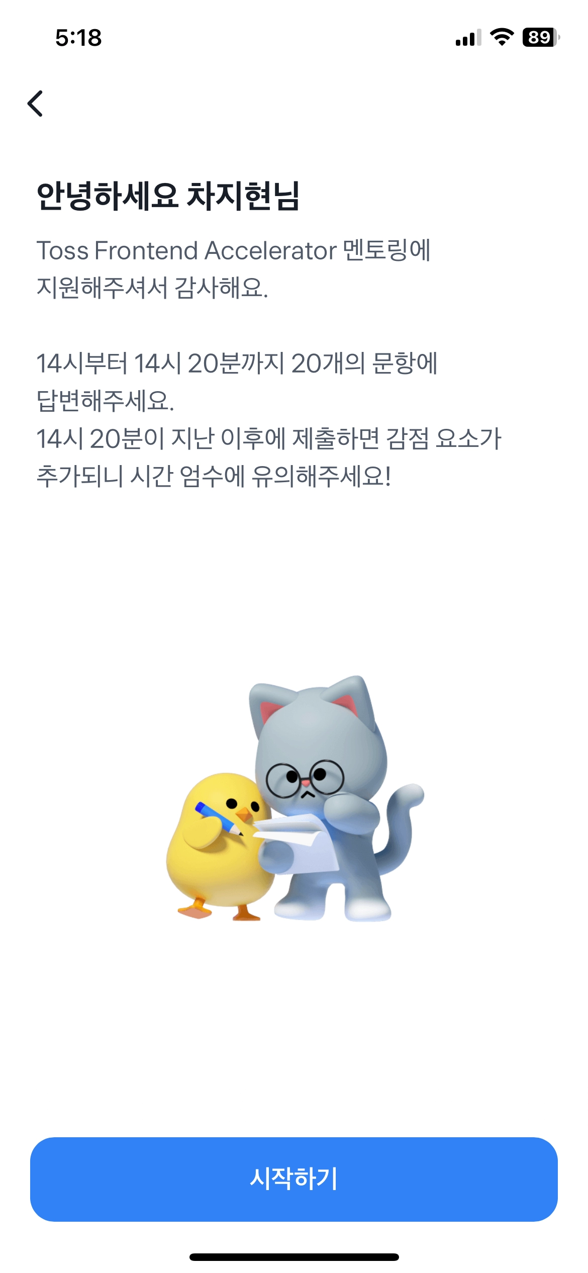 안녕하세요 차지현님, 토스 Frontend Accelerator 시험장이 열렸어요. 이 메세지를 눌러 시험장으로 입장해주세요.