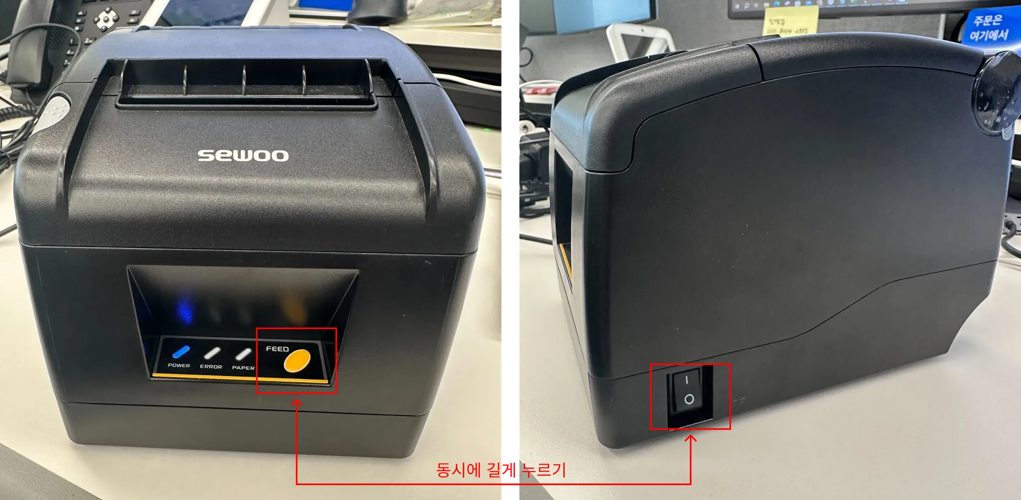 용지가 길게 출력되면 2번 프린터 설정을 위해 FEED 버튼을 두 번 눌러주세요.
