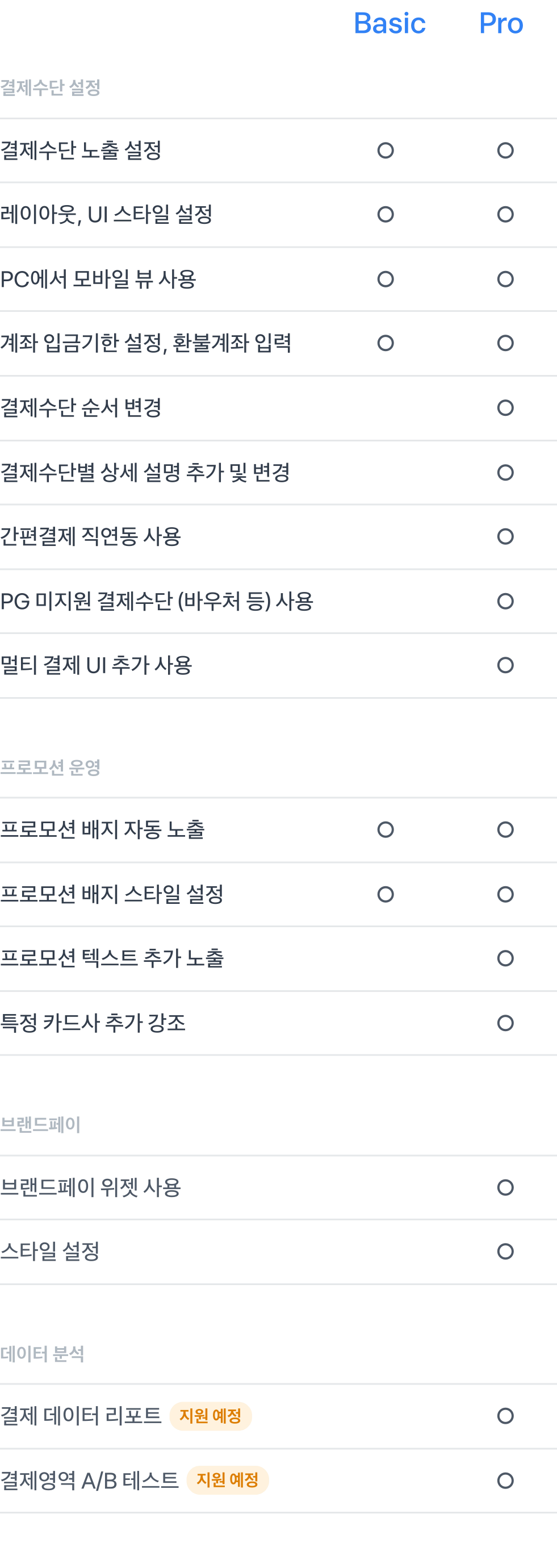 결제위젯 Pro 플랜은 더욱 높은 수준의 커스텀이 필요한 가맹점을 위해, 가맹점 별 추가 커스텀과 최적화 기능이 제공되는 토스페이먼츠의 ‘유료’ 서비스 입니다. (결제위젯 Basic 플랜은 무료 서비스입니다.)