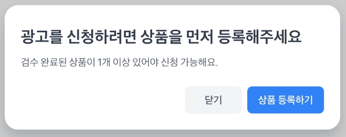 오른쪽 상단의 광고 신청하기를 클릭 후, 아래와 같이 노출된 팝업을 확인해 주세요.