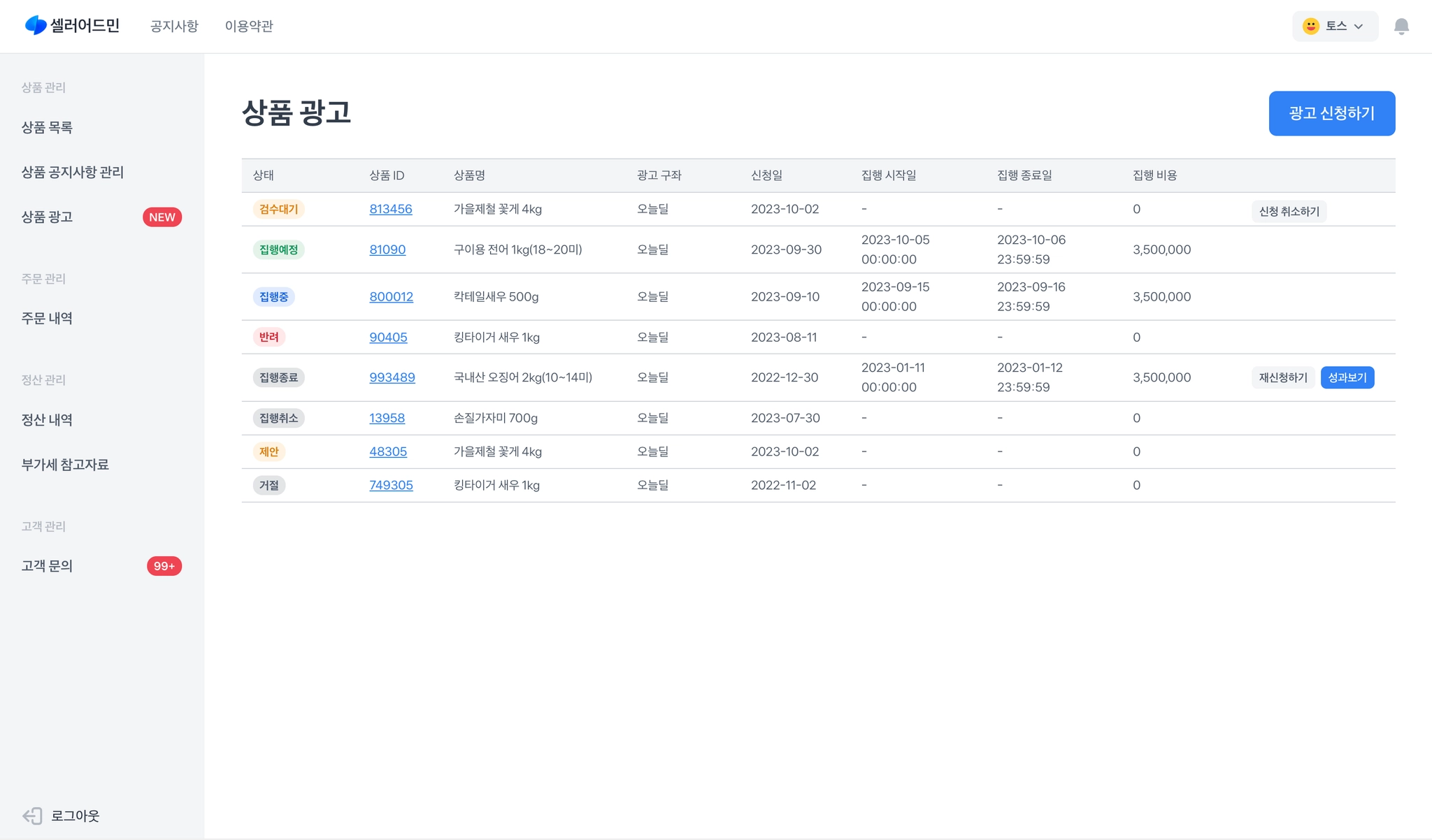 셀러 어드민을 통해서 신청받는 광고 구좌 외, 일부는 무료 구좌로 운영하고 있어요.