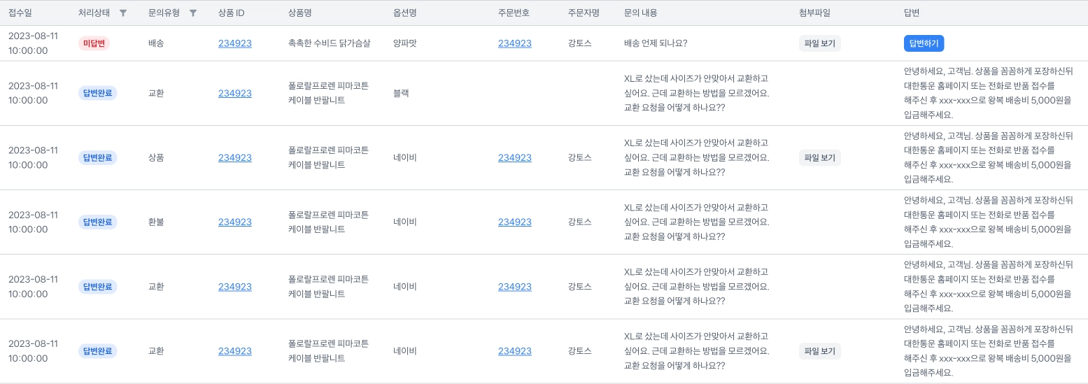 한 명의 고객이 여러 번 문의를 남겨주실 수 있어요. 주문번호 검색 기능 이용이 가능하오니 고객 문의가 여러 개일 경우 내용을 상세히 확인 후 답변해 주세요.
