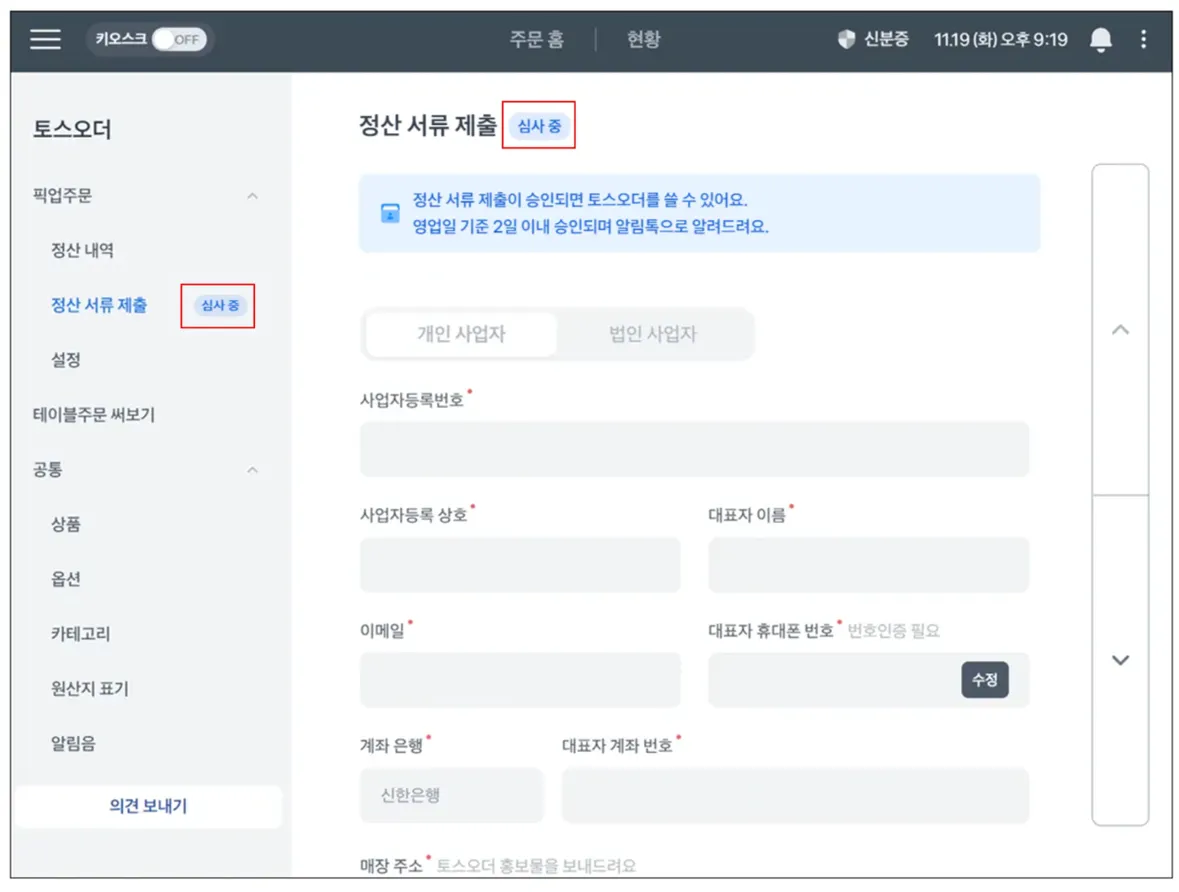 토스오더는 정산 서류 제출 후 승인이 완료되어야 사용 가능해요.