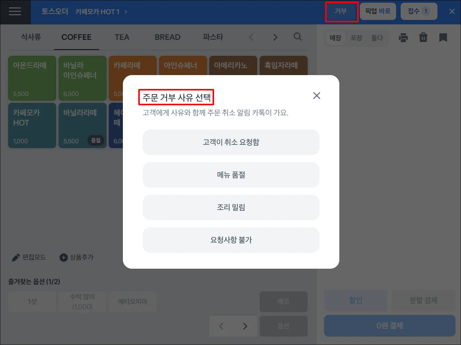 메뉴를 고른 후 결제하면 토스 포스 상단에 주문 접수 알림이 떠요.