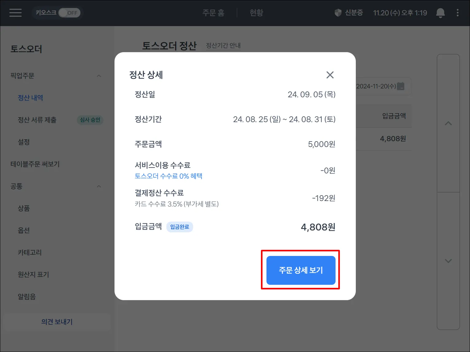 포스 왼쪽 상단 ≡ 버튼 > 키오스크·토스오더 > 토스오더 관리 > 정산 내역에서 확인 할 수 있어요.