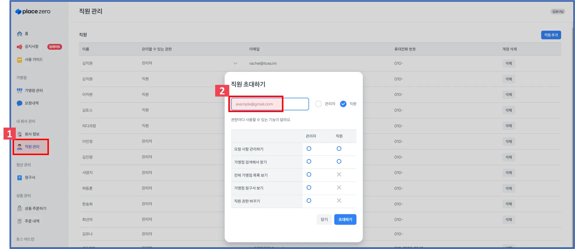 메일 주소를 입력하고 관리자와 직원 권한 선택 후 초대하기를 눌러주세요.
