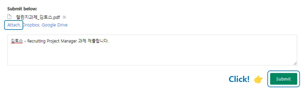 3. [Attach] 버튼을 눌러 완성한 과제물을 첨부한 후, [Submit] 버튼을 눌러 제출해주세요.