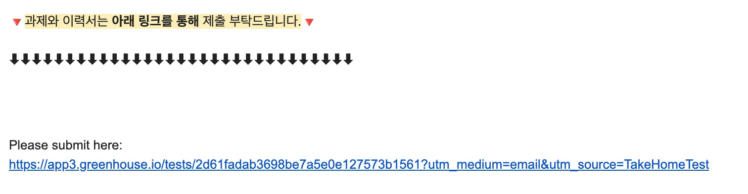 1. 과제 메일 최하단의 ‘Please submit here’ 아래 파란색 링크를 클릭해요.
