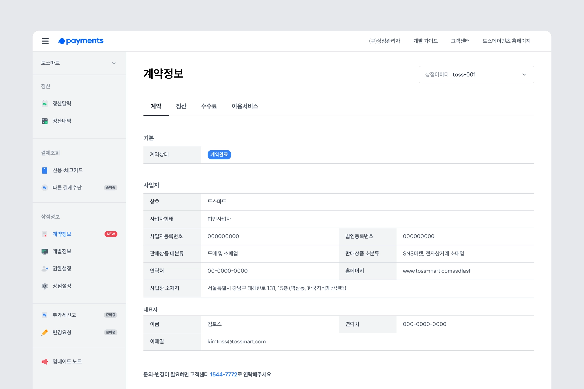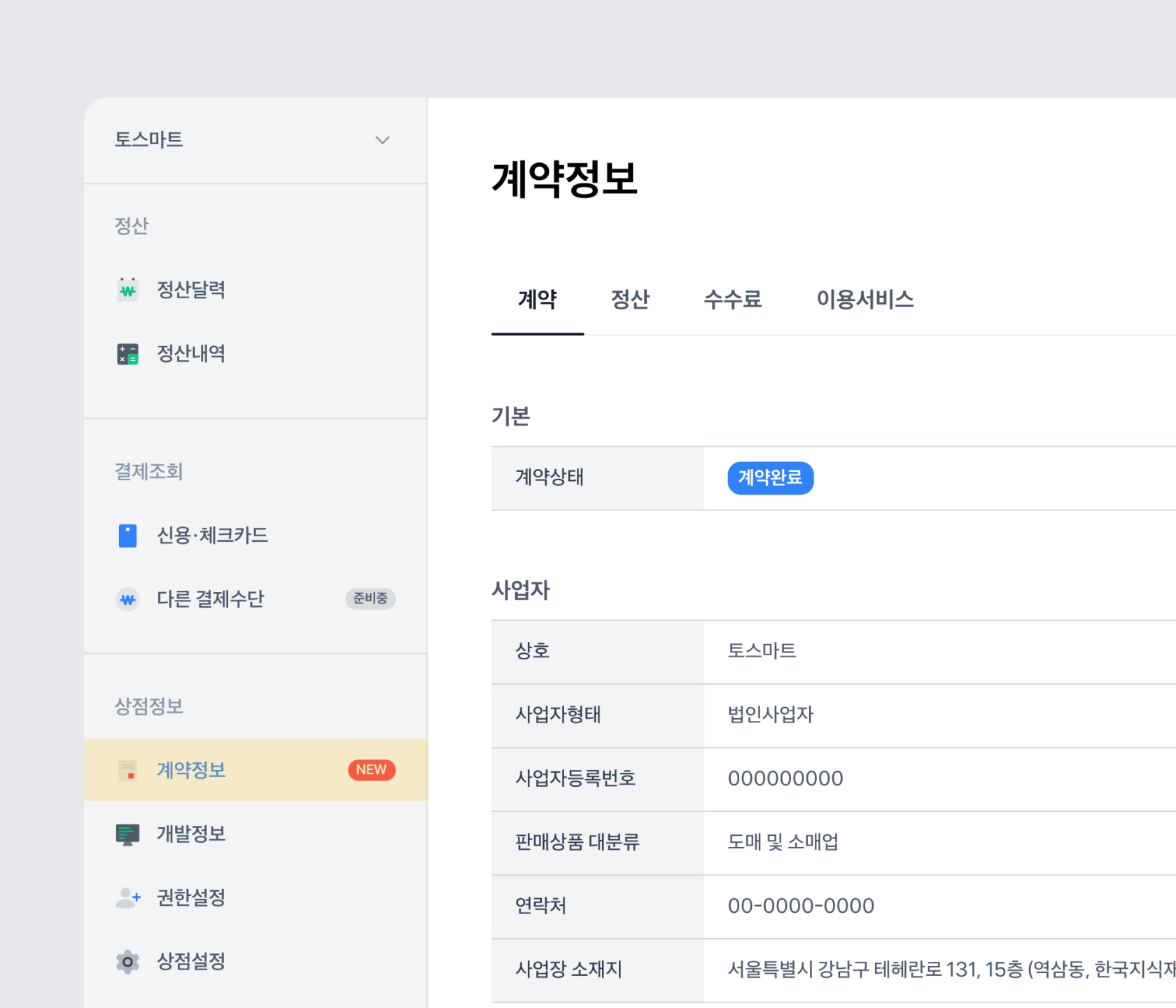 새 상점관리자 → 상점정보 → 계약정보