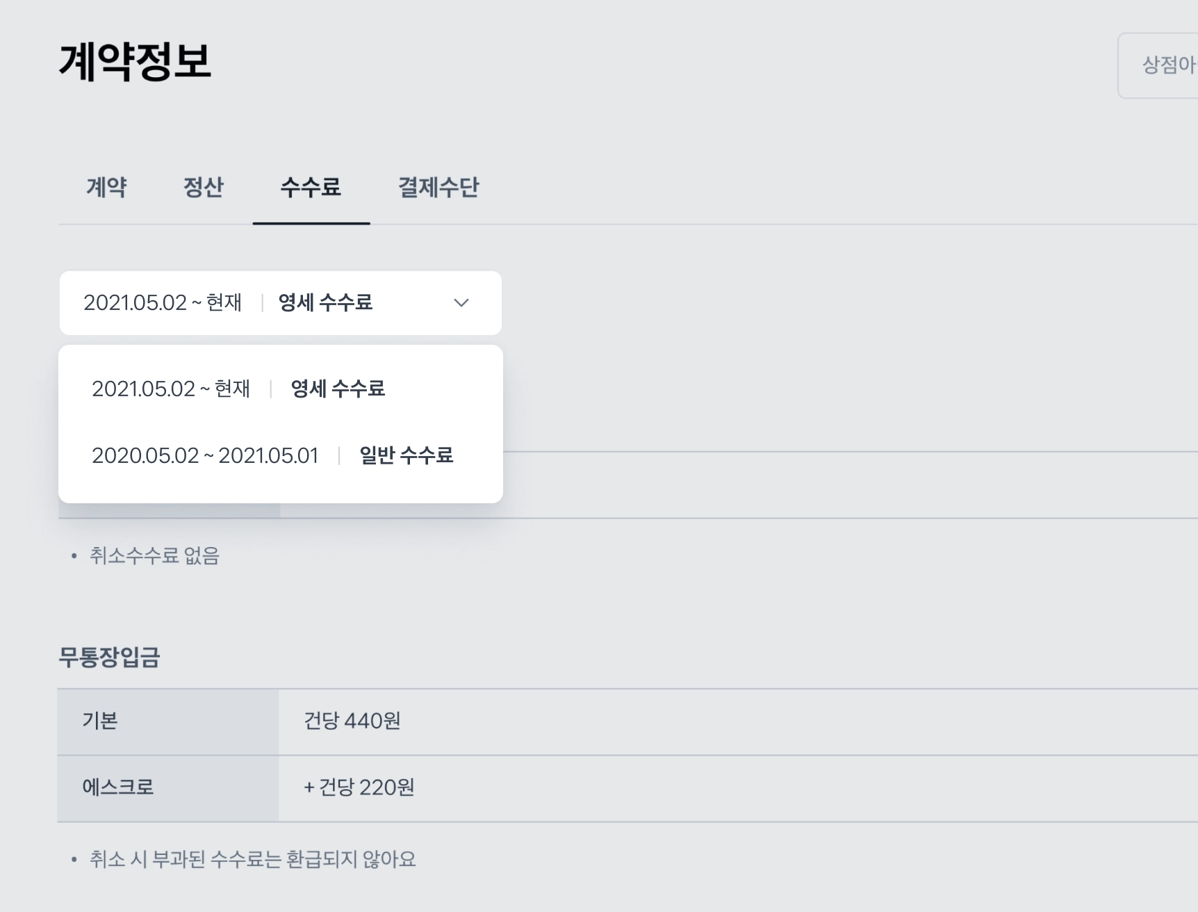 결제수단에 따라 다른 수수료, 이제 계약정보 페이지에서 한눈에 확인해 보세요. 이해를 돕기 위해 부가세가 포함된 수수료를 적어뒀어요.