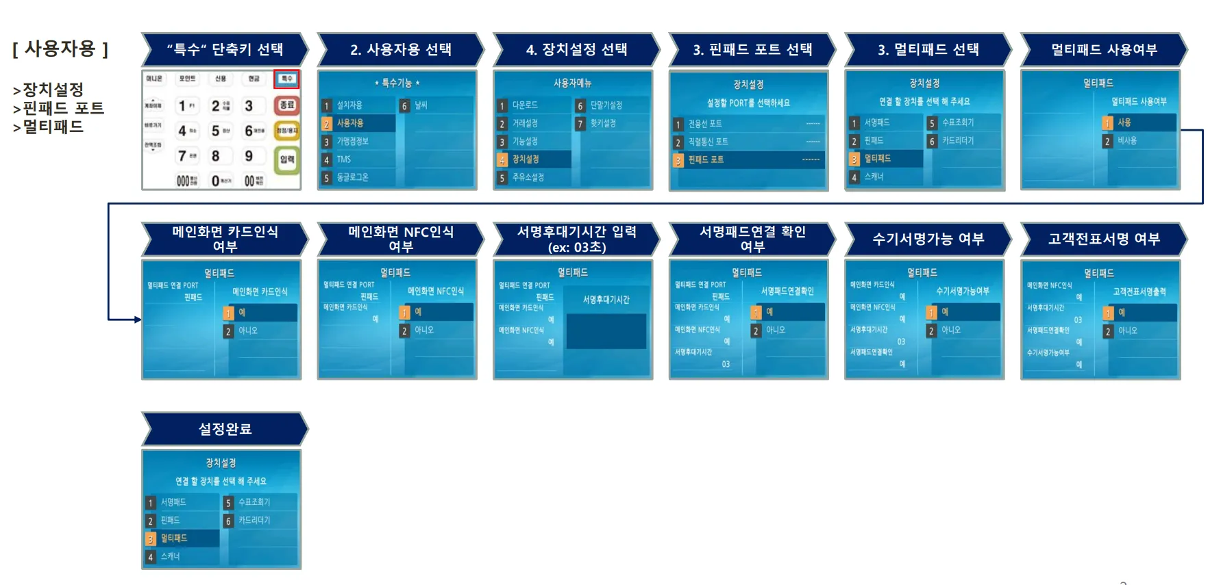 ‘특수’ 단축키 선택 → 2. 사용자용 선택 → 4. 장치설정 선택 → 3. 핀패드 포트 선택 → 3. 멀티패드 선택 → 멀티패드 사용여부 체크 → 메인화면 카드인식 여부 체크 → 메인화면 NFC 인식 여부 체크 → 서명 후 대기시간 입력 → 서명패드 연결 확인 여부 체크 → 수기서명가능 여부 체크 → 고객전표서명 여부 체크 → 설정 완료