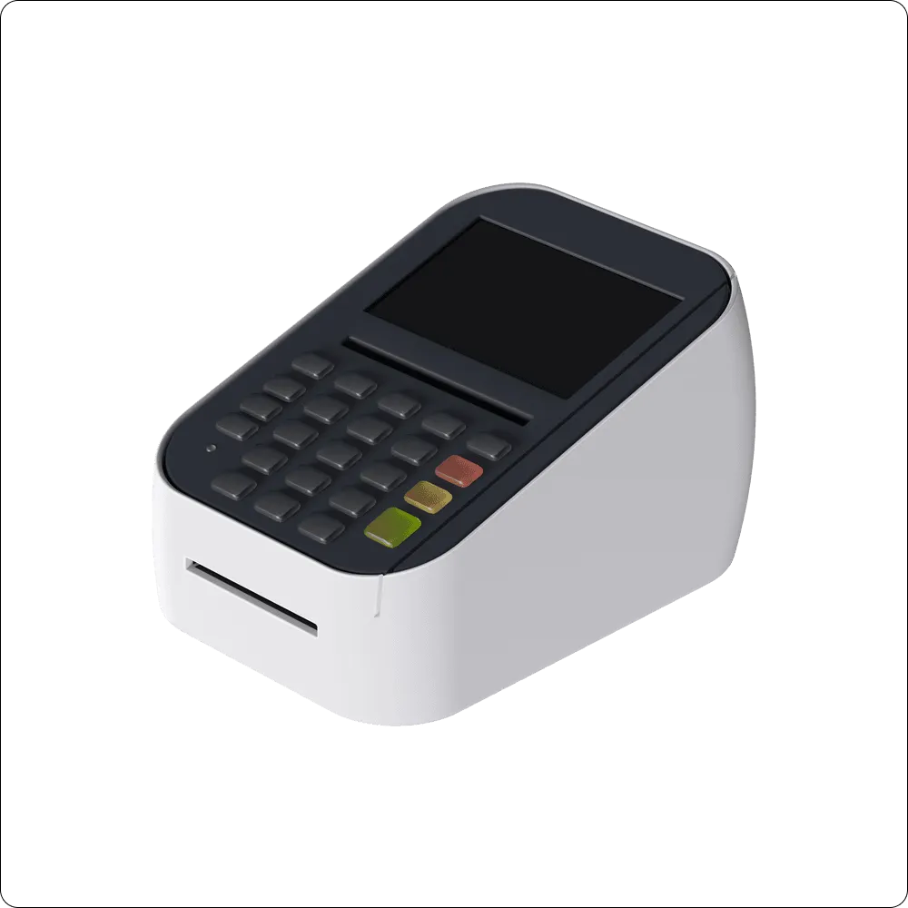 토스 프론트2는 C타입 일체형 전원 코드를 제공해드려요. 전원 버튼은 단말기 뒷 부분에 있어요.