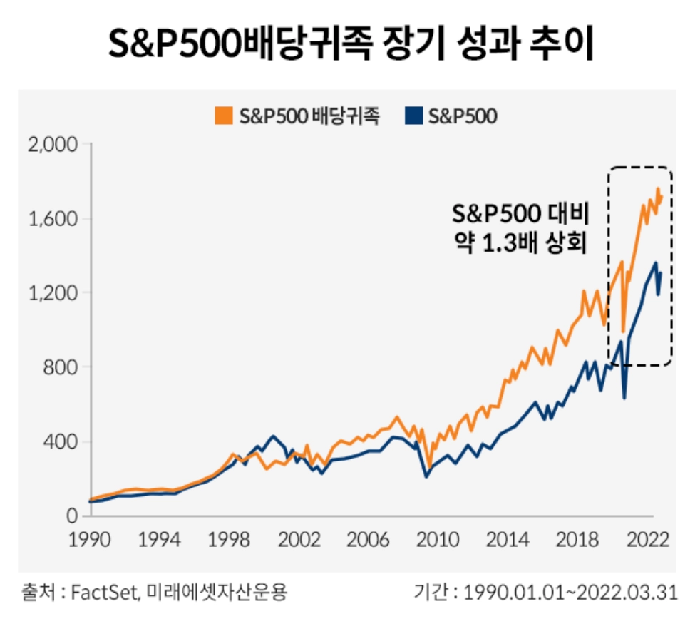 주식시장은 일반적으로 ‘안정성’과 ‘성장성’은 양립하기 어렵다고 생각해요. 하지만 배당귀족주는 다릅니다. 1990년부터 2022년 9월까지, 배당귀족주는 S&P500 대비 56% 높은 누적 수익률을 보였어요.