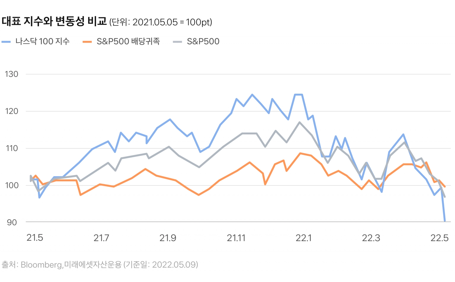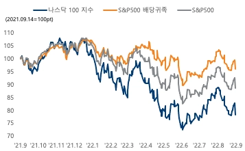 지난 1년 동안 나스닥 100 지수는 30%, S&P 500은 22%의 변동성*을 보인 반면, 반면 배당귀족 지수의 변동성은 이보다 낮은 17%에 그쳤어요. 특히 주가가 떨어지는 약세장에서 상대적으로 낮은 변동성을 보이며 수익률을 방어해줬죠.