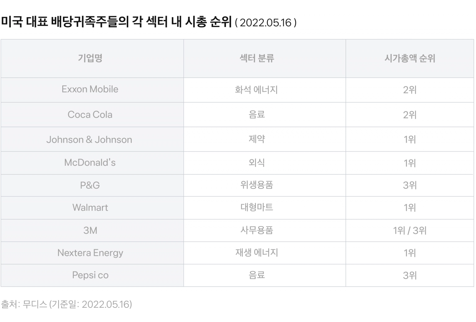 일례로 신용평가사 무디스는 대표적인 배당귀족주 존슨 앤 존슨를 Aaa, 월마트를 Aa2, P&G를 Aa3으로 평가해요. 참고로, 우리나라의 신용등급이 Aa2랍니다.