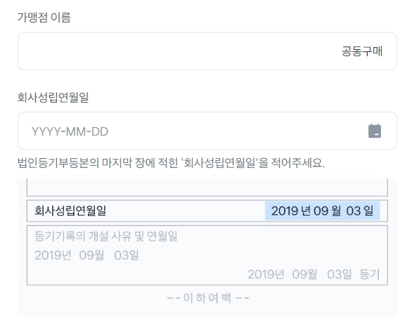 화면 예시처럼 법인 등기부등본의 마지막 장에 적힌 회사성립연월일을 작성해 주세요