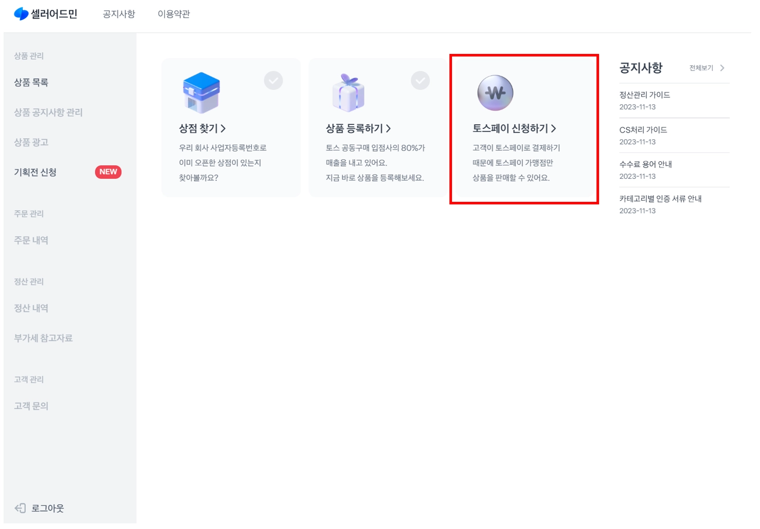 토스 앱 내에서 상품을 노출하고 결제를 하는 서비스로 토스페이 신청이 완료 되어야 상품 등록 후 판매를 할 수 있어요.