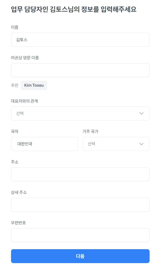 예를 들어, 업무 담당자라면 대표자의 정보가 아닌 담당자의 정보로 인증을 진행해 주세요.