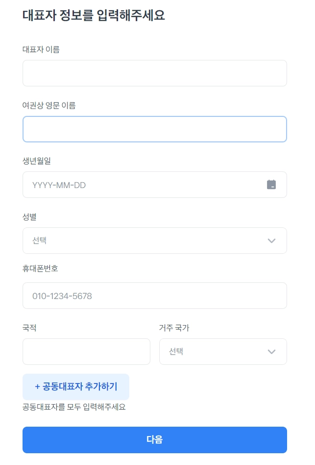 공동 대표가 있다면, 입력 칸 추가하기를 통해 모든 대표자의 정보를 입력해 주세요