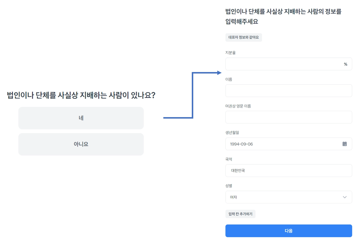 개인을 선택 하셨다면, 지분을 보유한 사람의 정보를 입력해 주세요