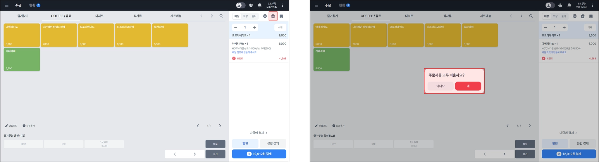 휴지통 버튼을 누르면 전체 주문 내역을 일괄 삭제 할 수 있어요.