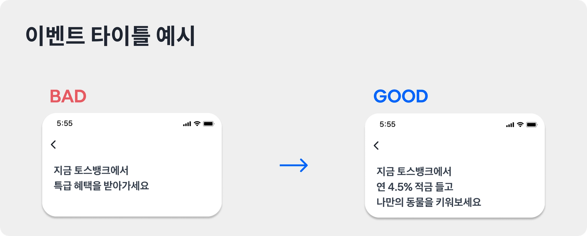 예) 토스 회원 전용 이벤트, 토스 X {브랜드명}, 토스 고객 한정 이벤트 , 토스 고객에게만 드려요 등