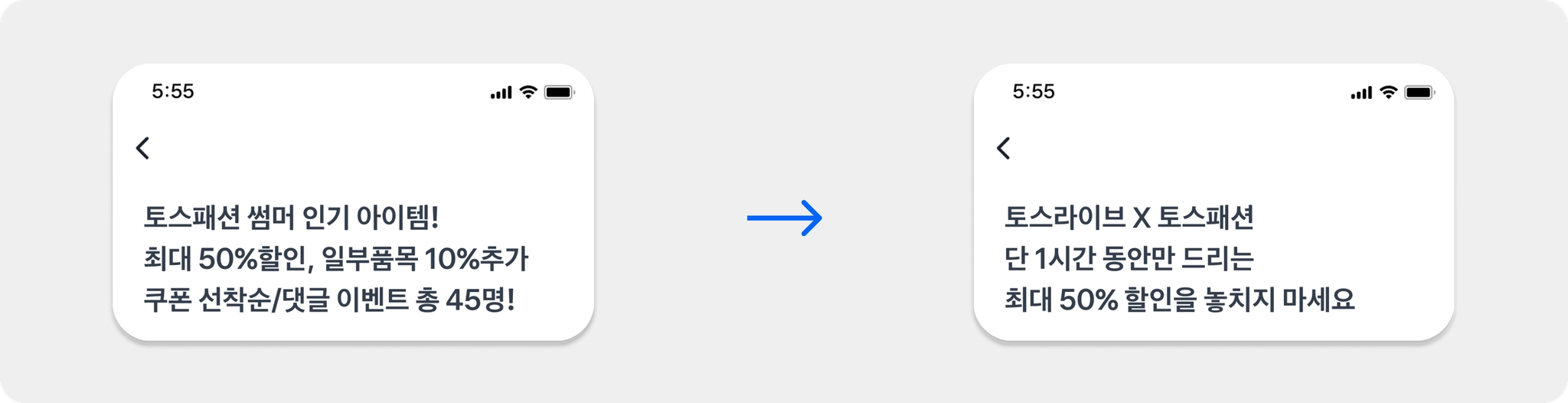 토스 UX 라이팅 가이드에 따라 불필요한 특수문자 사용을 지양하고 있습니다.